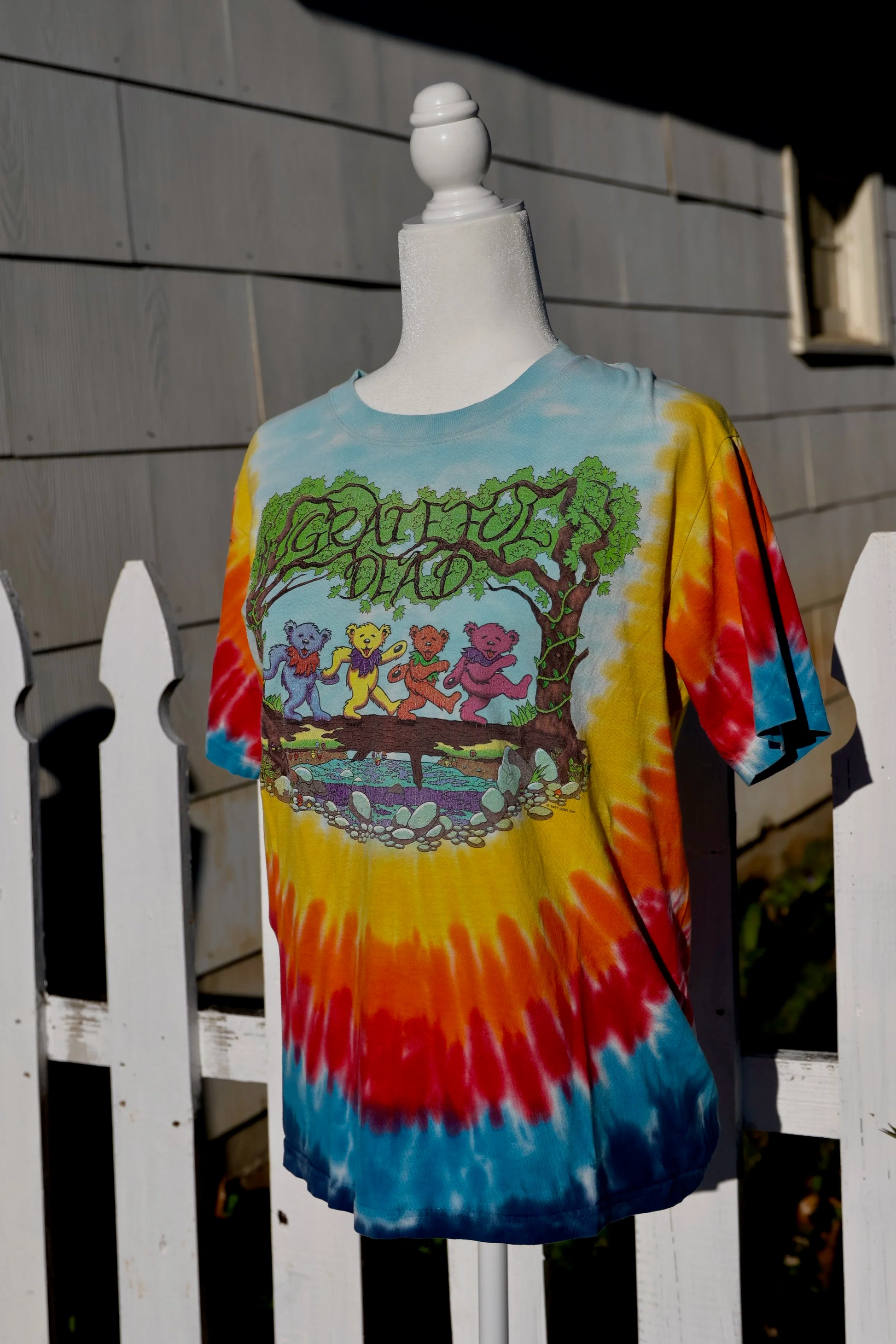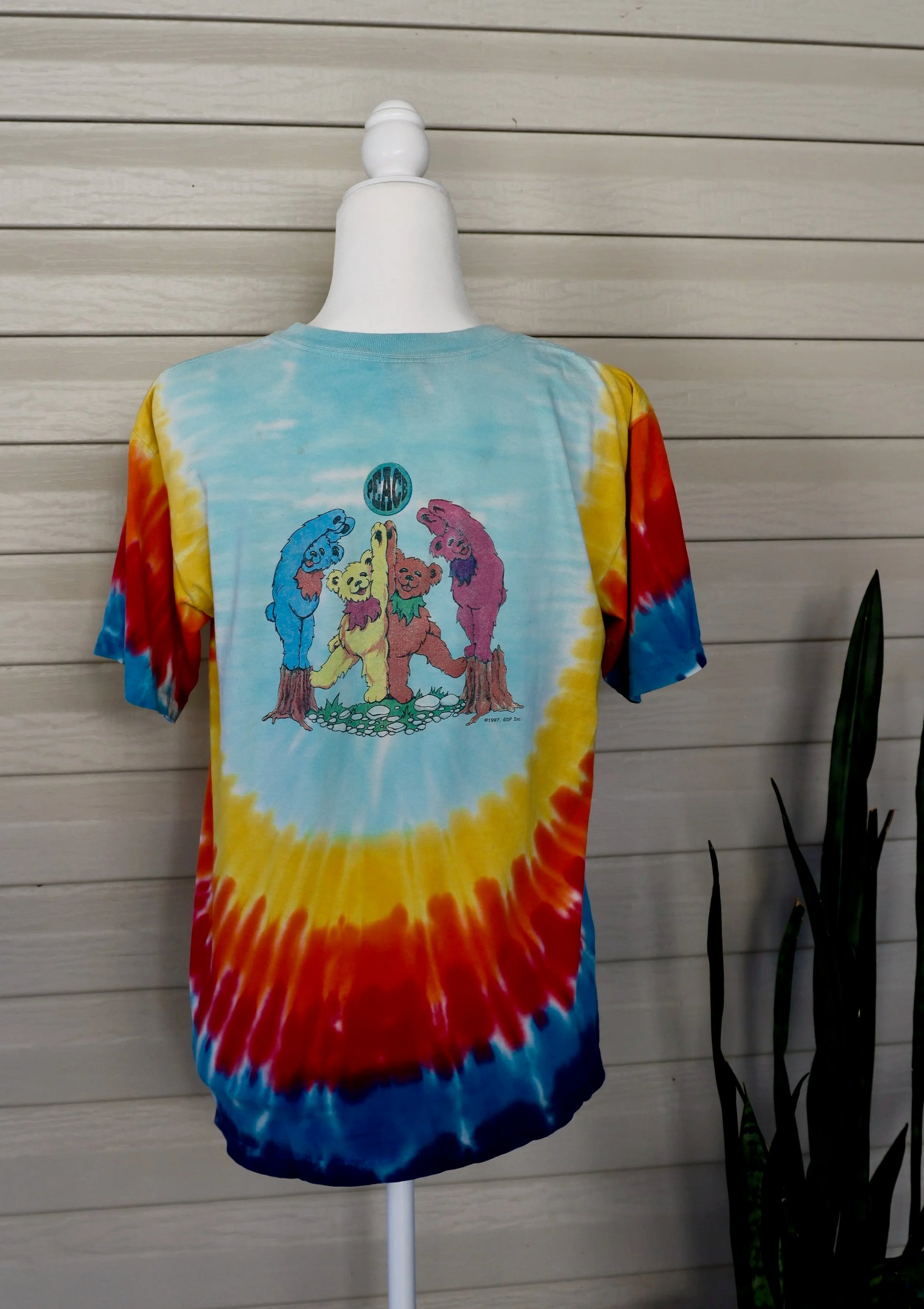 1997 Sundog Grateful Dead Dancing Bears tee in a bold rainbow tie-dye. Soft, broken-in, and loaded with retro Deadhead charm.