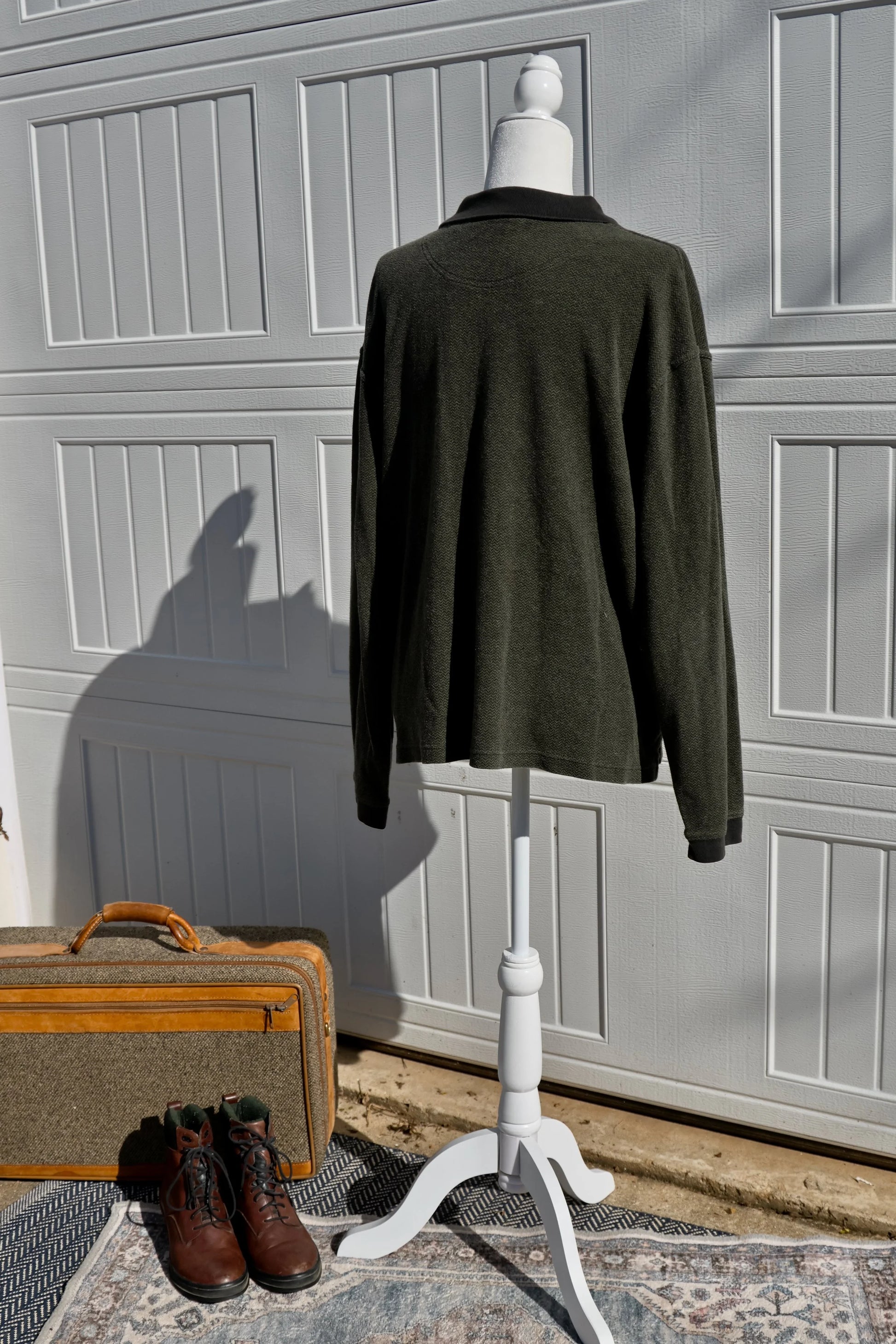 A vintage Eddie Bauer polo transformed for winter adventure life — featuring a handcrafted leather snowboarder and mountain silhouette stitched onto the chest. The textured forest-green knit gives it a cozy lodge-core feel, while the soft drape makes it wearable for men and as an oversized winter top for women.