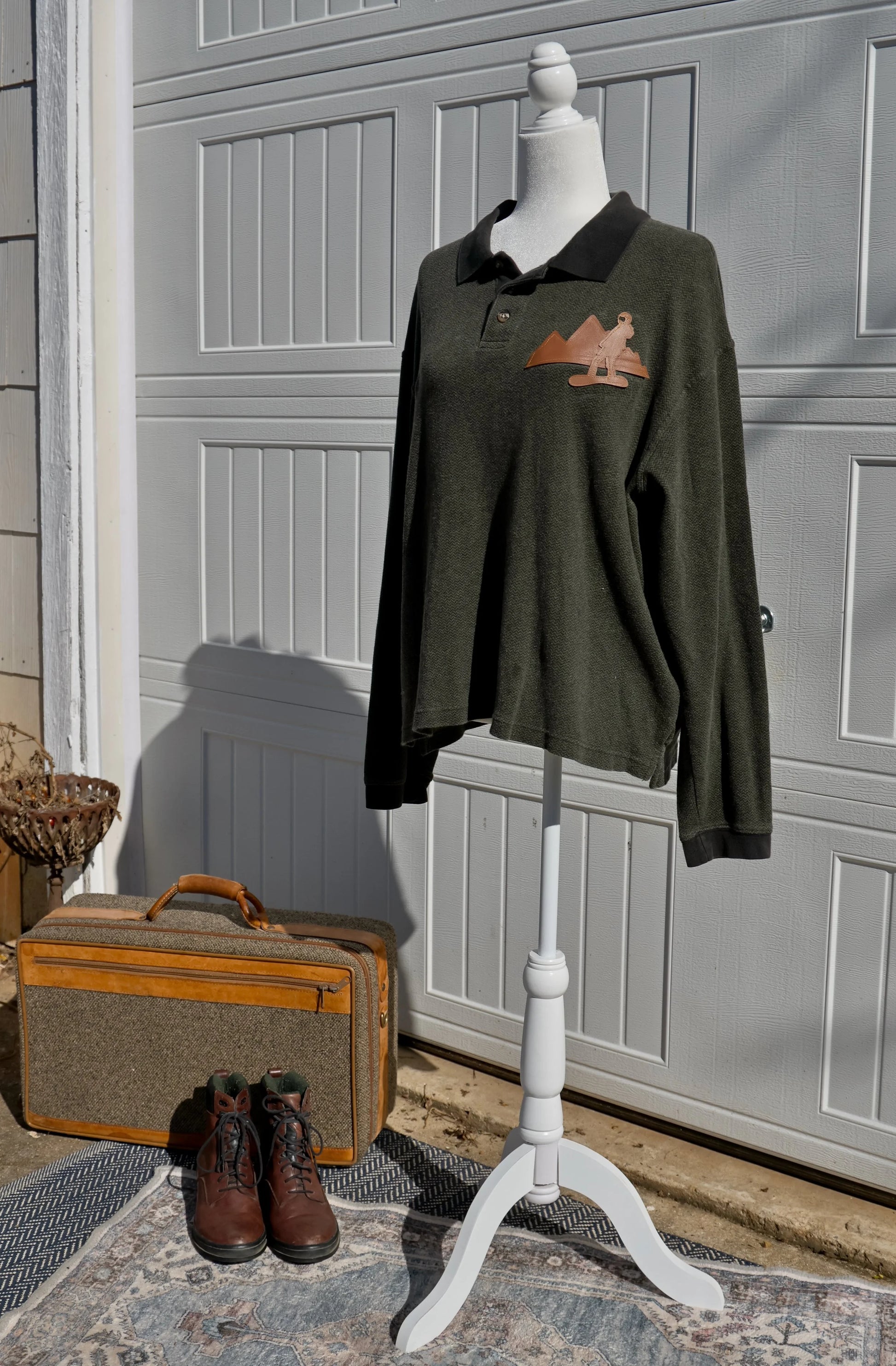 "Backcountry Boarder Polo" - Upcycled Eddie Bauer with Leather Mountain Patch