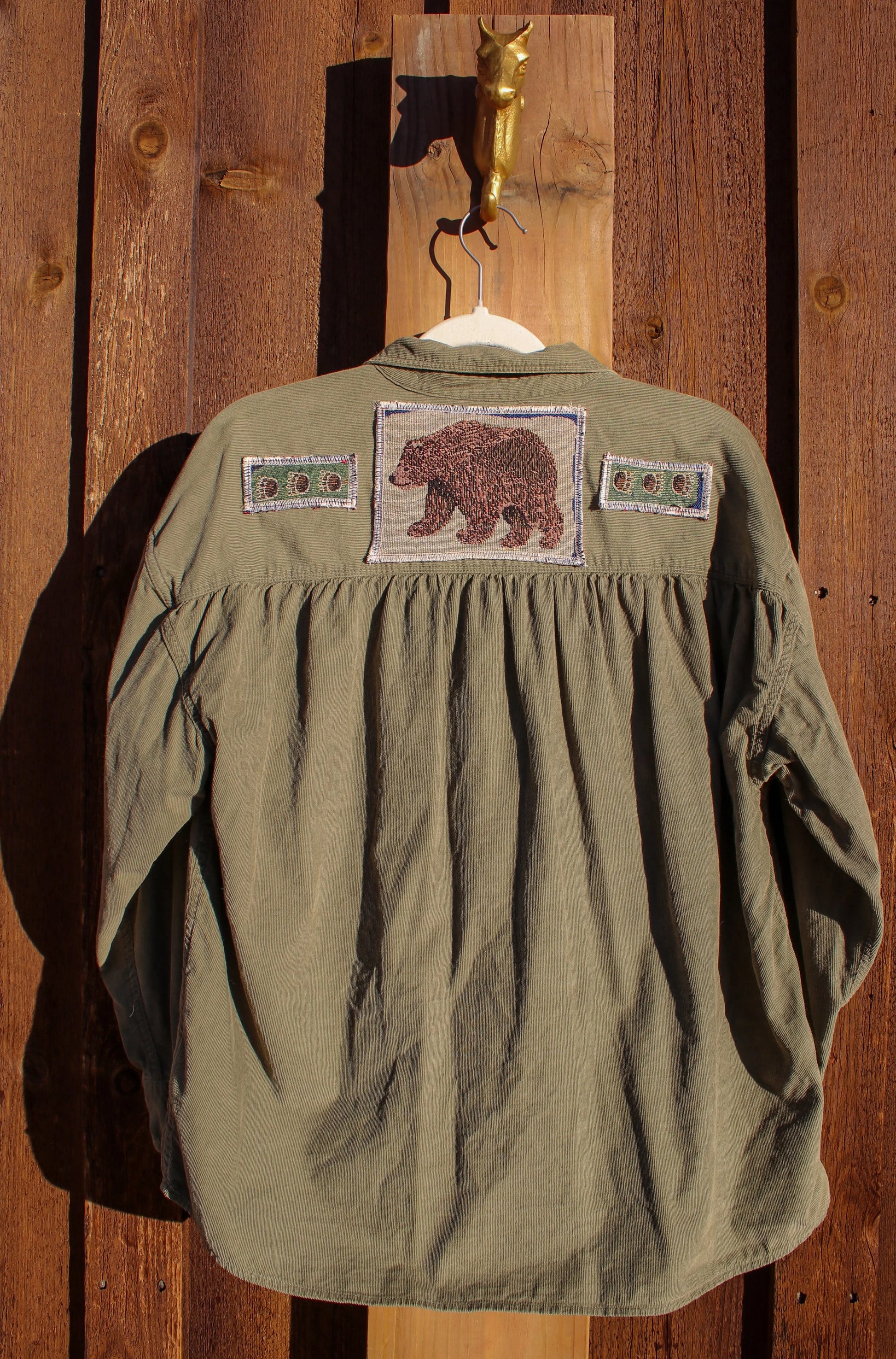 “Bear Creek Trail” – Upcycled Lee Olive Button Down with Bear Patch