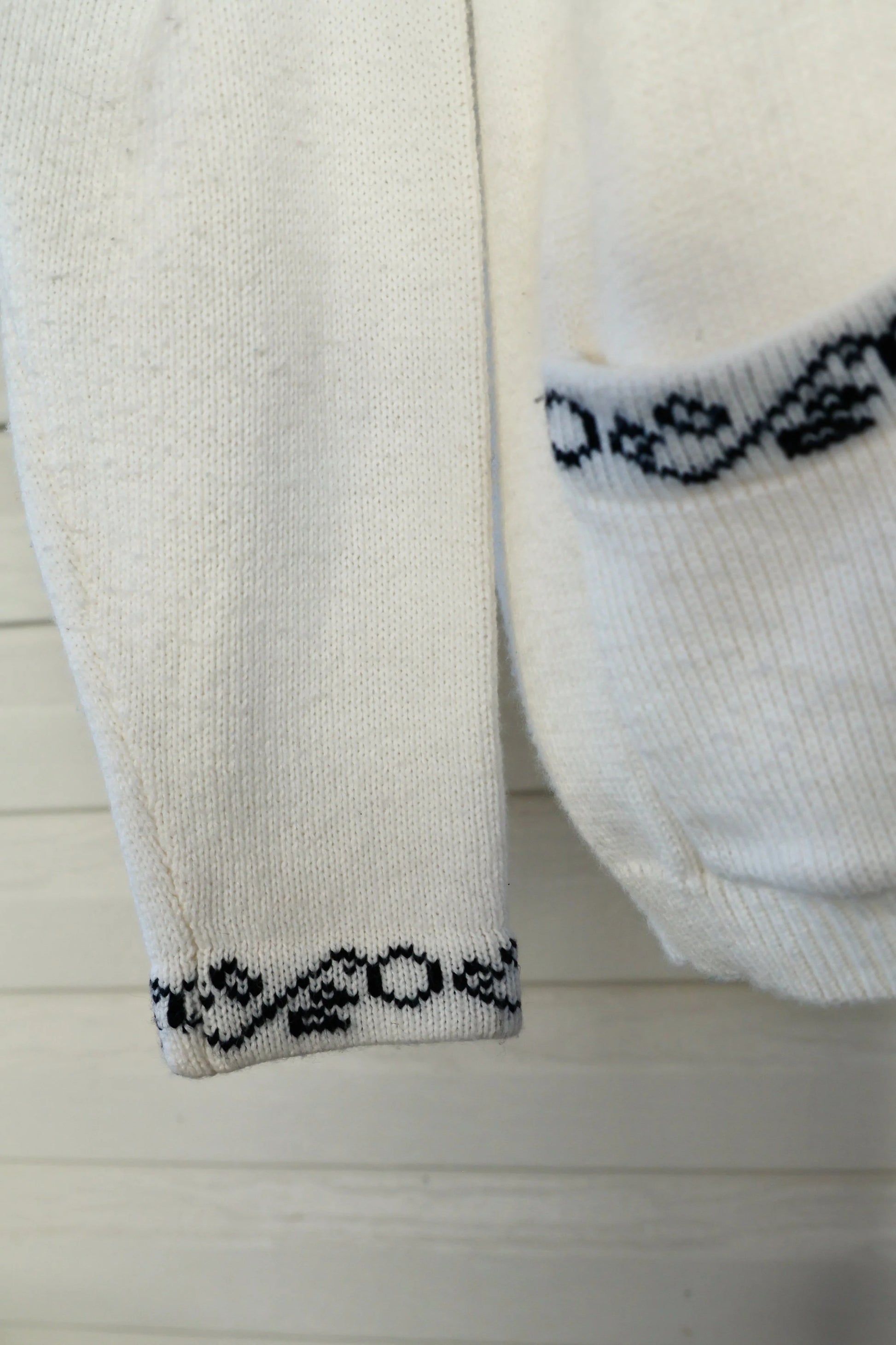 A soft and timeless cream knit cardigan from Extra Touch featuring black trim detailing along the neckline, placket, pockets, and cuffs. Made from 100% acrylic, this piece is lightweight, comfortable, and perfect for layering through every season. The relaxed 20/40W fit gives it an easy, effortless drape — ideal for cozy days, mountain-town errands, or styled with denim for a clean, classic look.