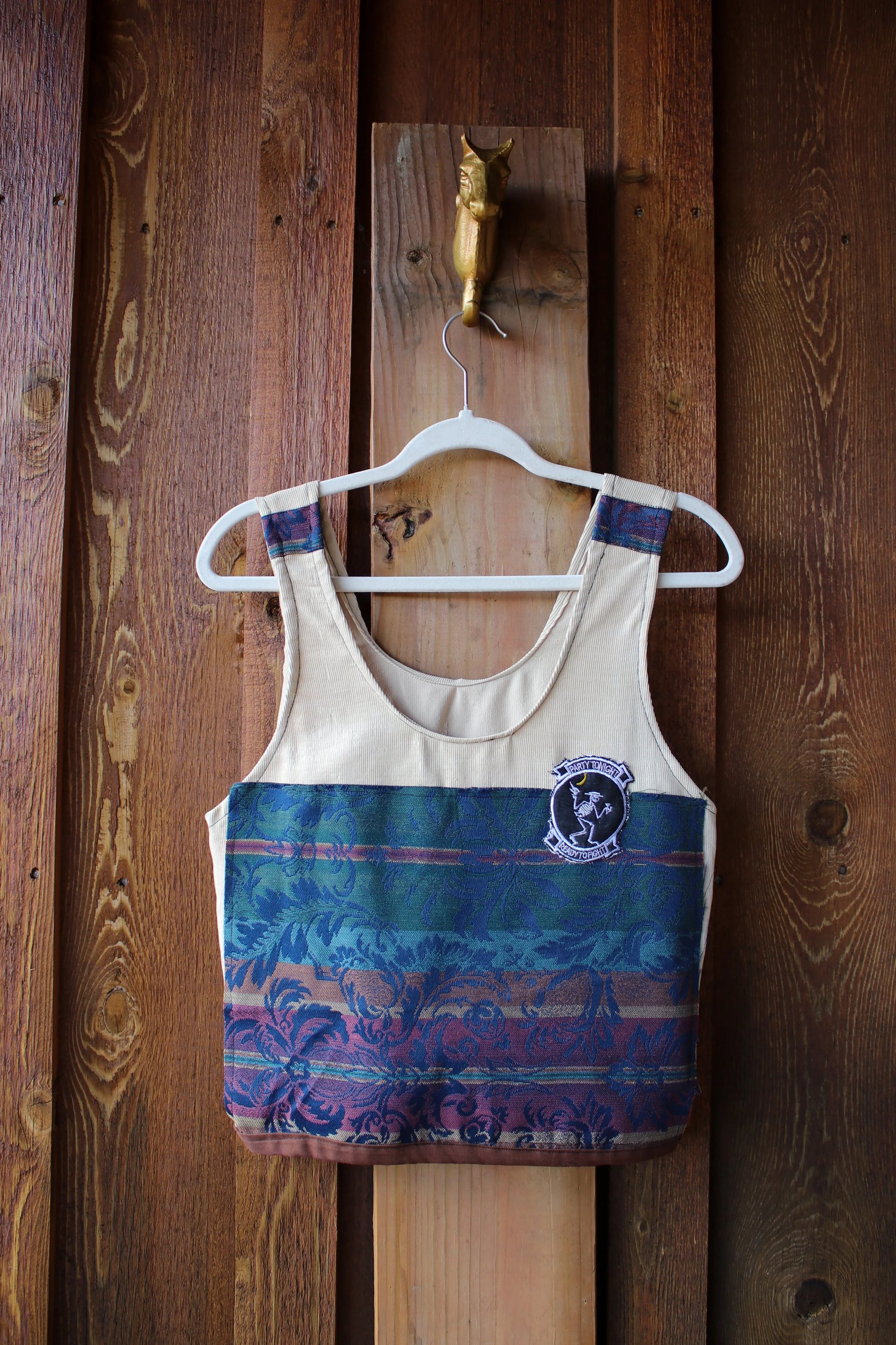Handmade tank from a vintage pillowcase + tablecloth, finished with a rare “Party Tonight Ready to Fight” Grateful Dead patch. Festival-ready and one-of-a-kind.