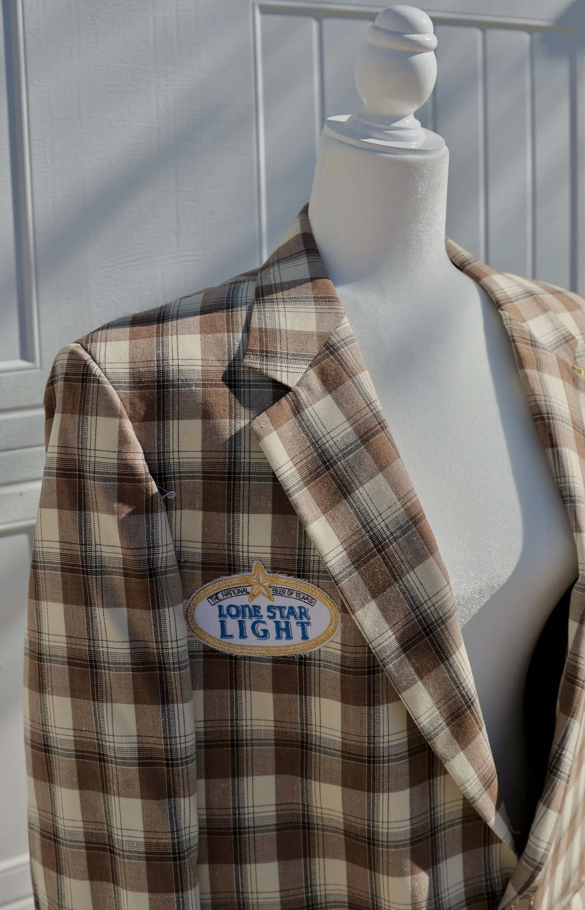 A one-of-a-kind upcycled blazer with full cowboy charm. Hand-added vintage patches — including Lone Star Light, Aces A/C Supply, and Houston Rodeo “Lil’ Rustlers” — bring a honky-tonk, rodeo-ready personality to this classic plaid coat. Soft structured shoulders, two-button front, and a longer silhouette make it perfect for styling over denim, dresses, or boots-and-bandana looks. A true vintage statement piece reimagined the Feral Friends way.