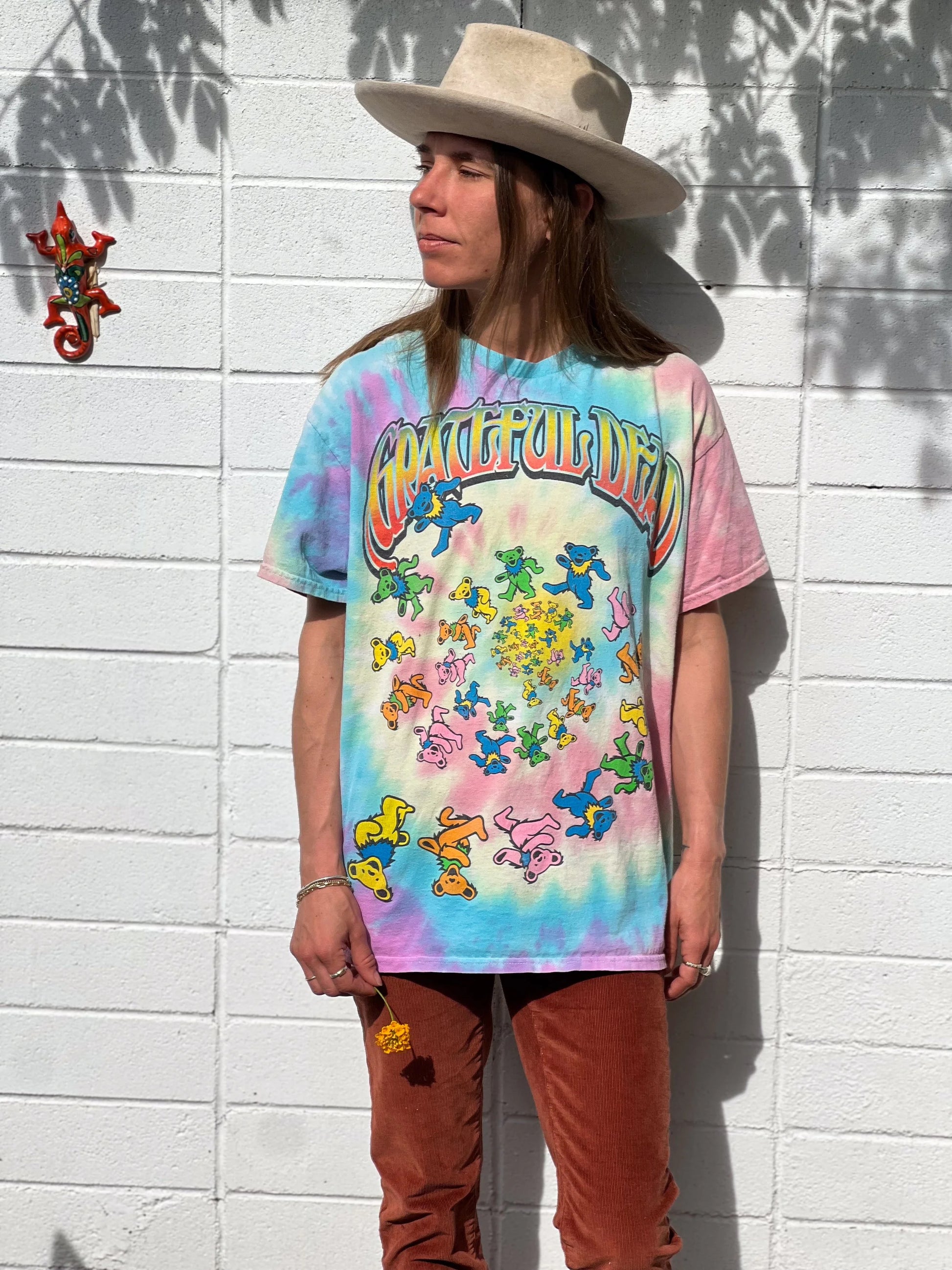 This vintage Grateful Dead tee from the 90s tour showcases the beloved dancing bears on a vibrant tie-dye background — a must-have piece for Deadheads and collectors alike.Size: Unisex