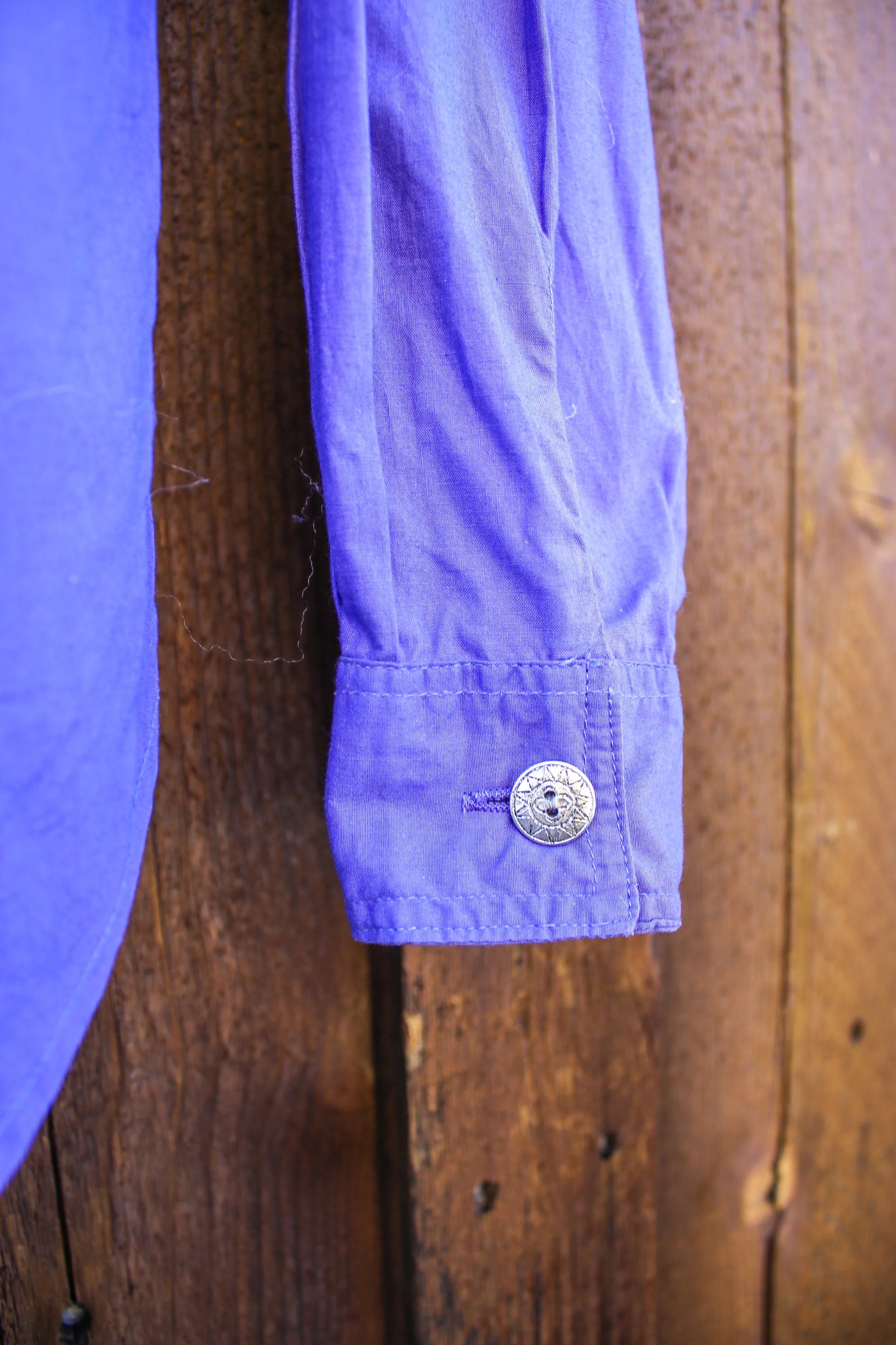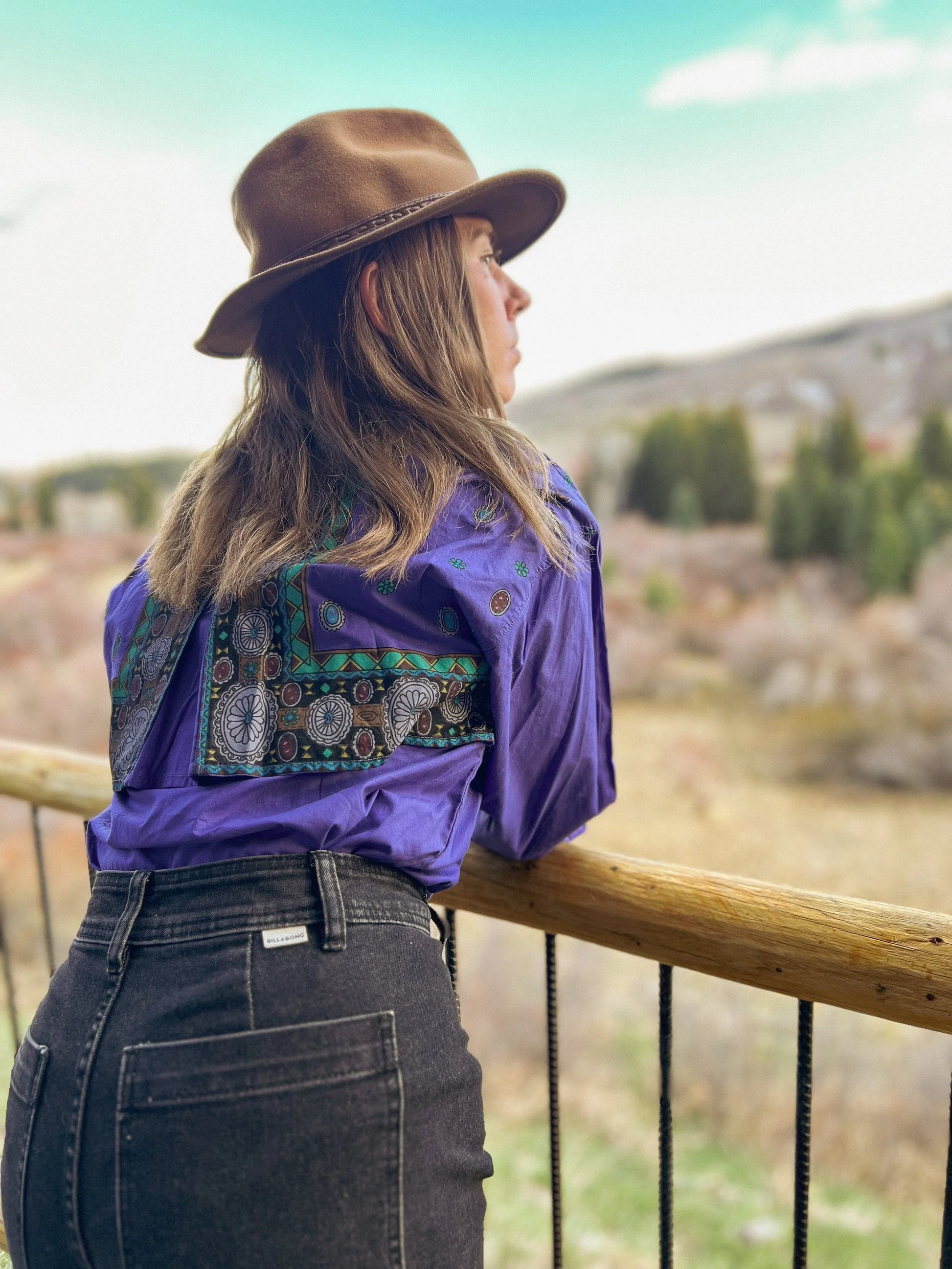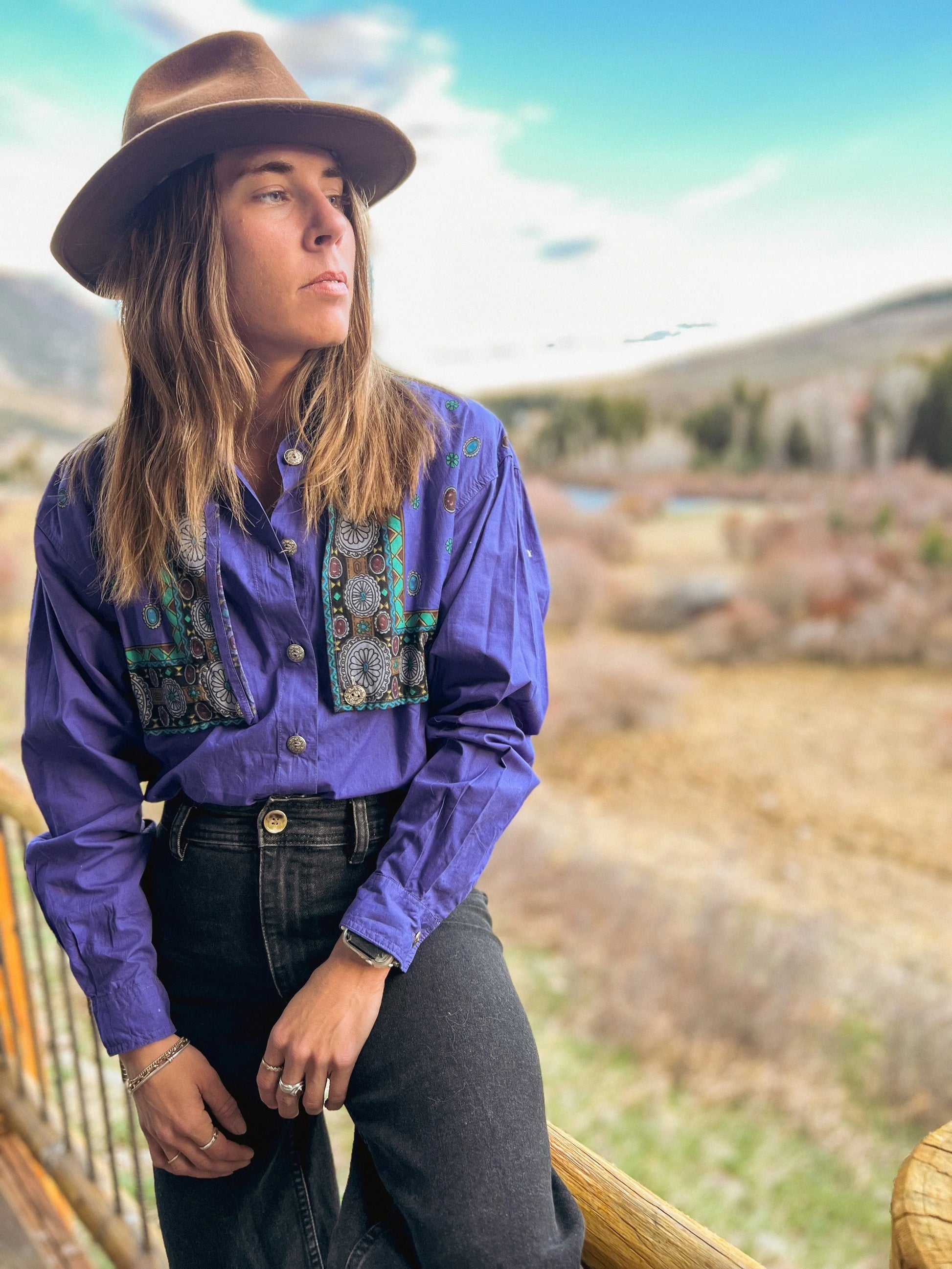 This vintage 1992 Adobe Rose western shirt is a true collectible, blending rugged western spirit with artistic flair. Made from 100% soft cotton in a deep indigo tone, it features a unique printed design throughout the fabric, adding a subtle but striking visual texture. The chest flap with sun-stamped metal buttons and structured western fit make this an authentic piece of early 90s cowboy-core fashion. Perfect for styling with high-rise denim, broken-in boots, or layered under a vintage suede jacket for the ultimate desert cowgirl look.Size: Women’s Small