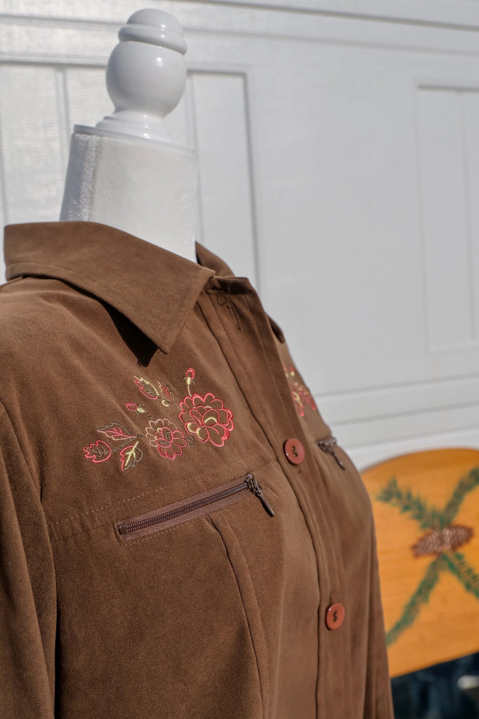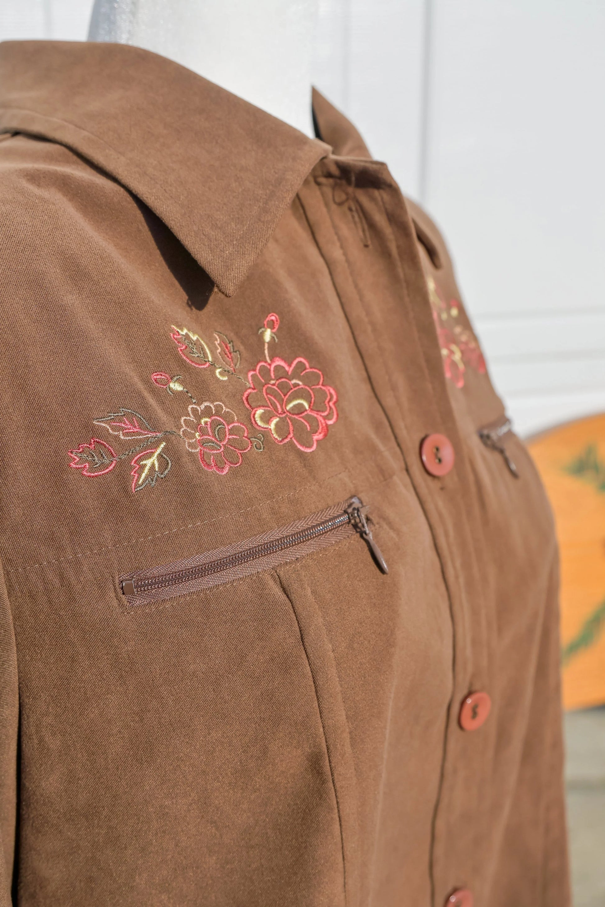 Vintage Allison Daley women’s brown button-down shirt featuring delicate floral embroidery and a functional zip pocket detail. A soft, structured blouse that blends everyday comfort with timeless craftsmanship — perfect for layering or standalone wear.