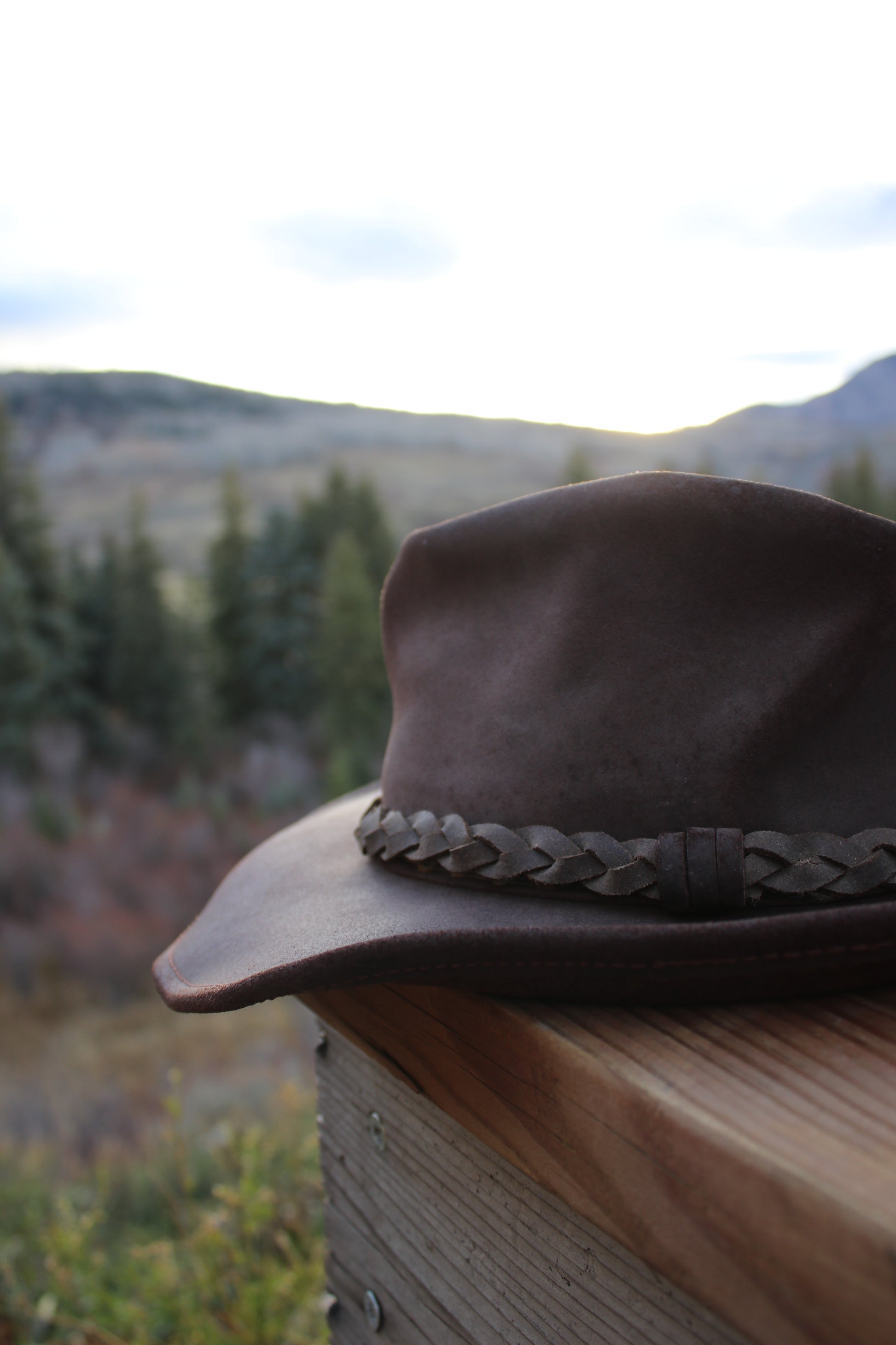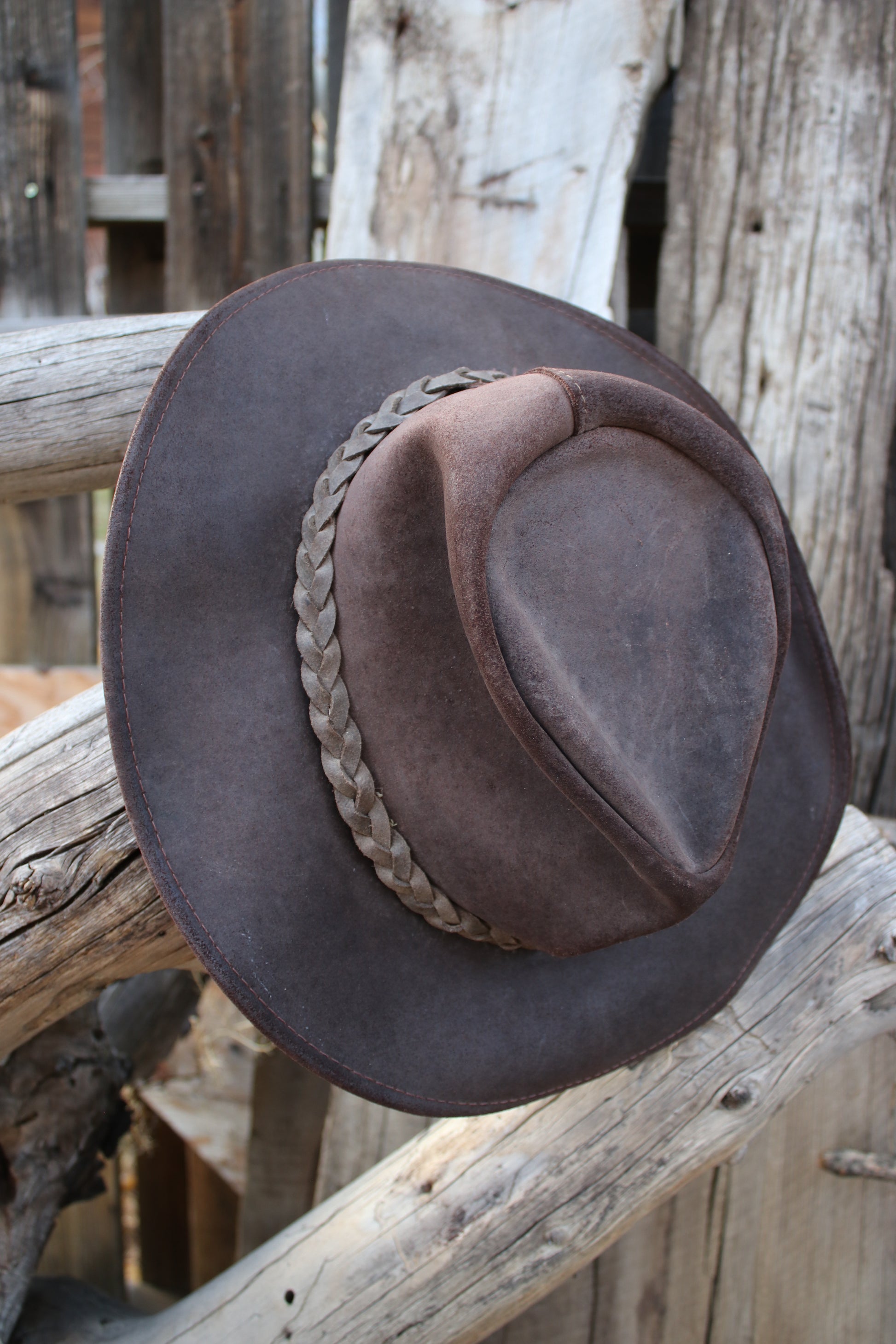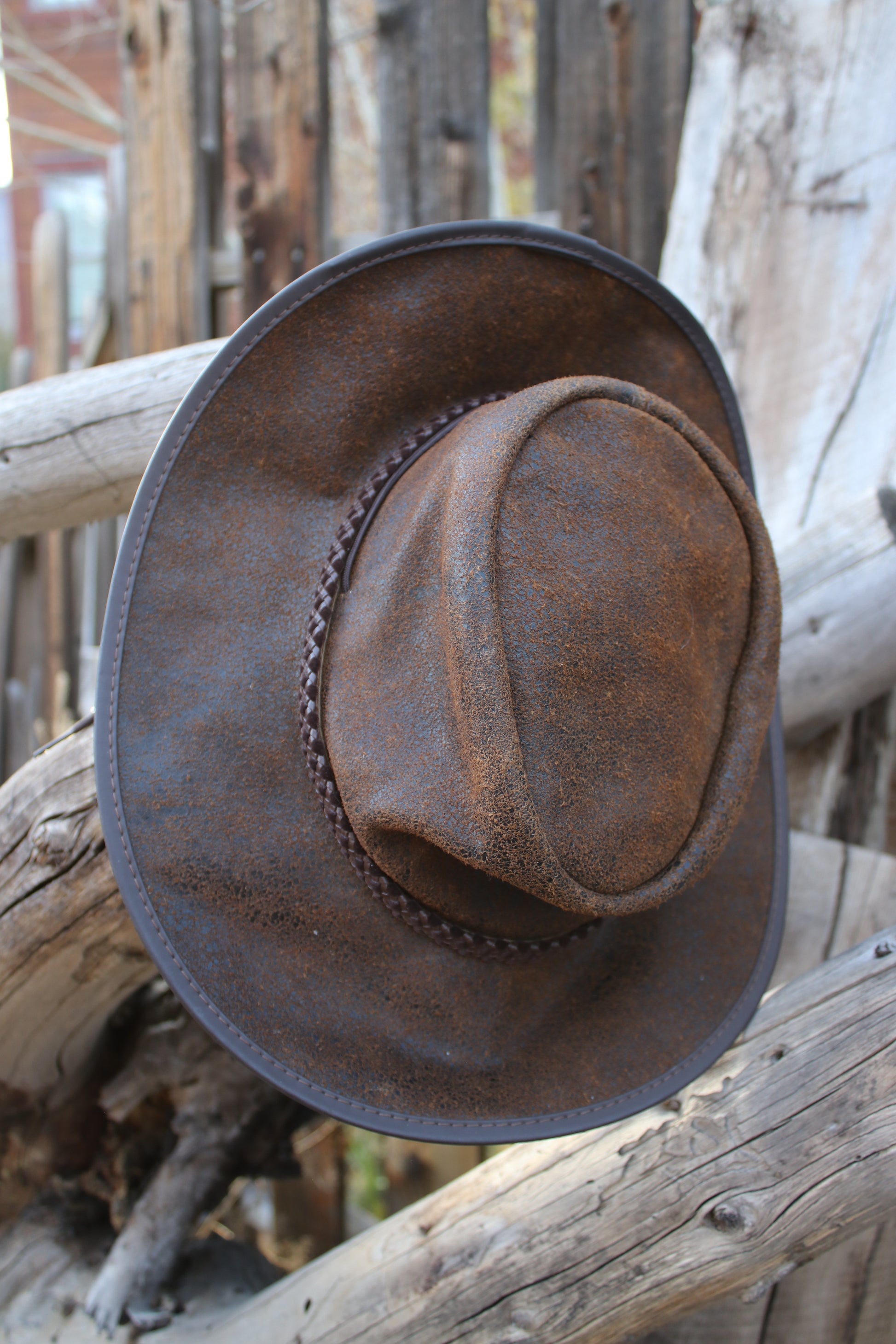 Vintage Henschel outback hat crafted from genuine distressed brown leather with a braided band detail and structured wide brim. Made in the USA, this rugged hat embodies western adventure and outdoor heritage — perfect for ranch days, road trips, or festival style.