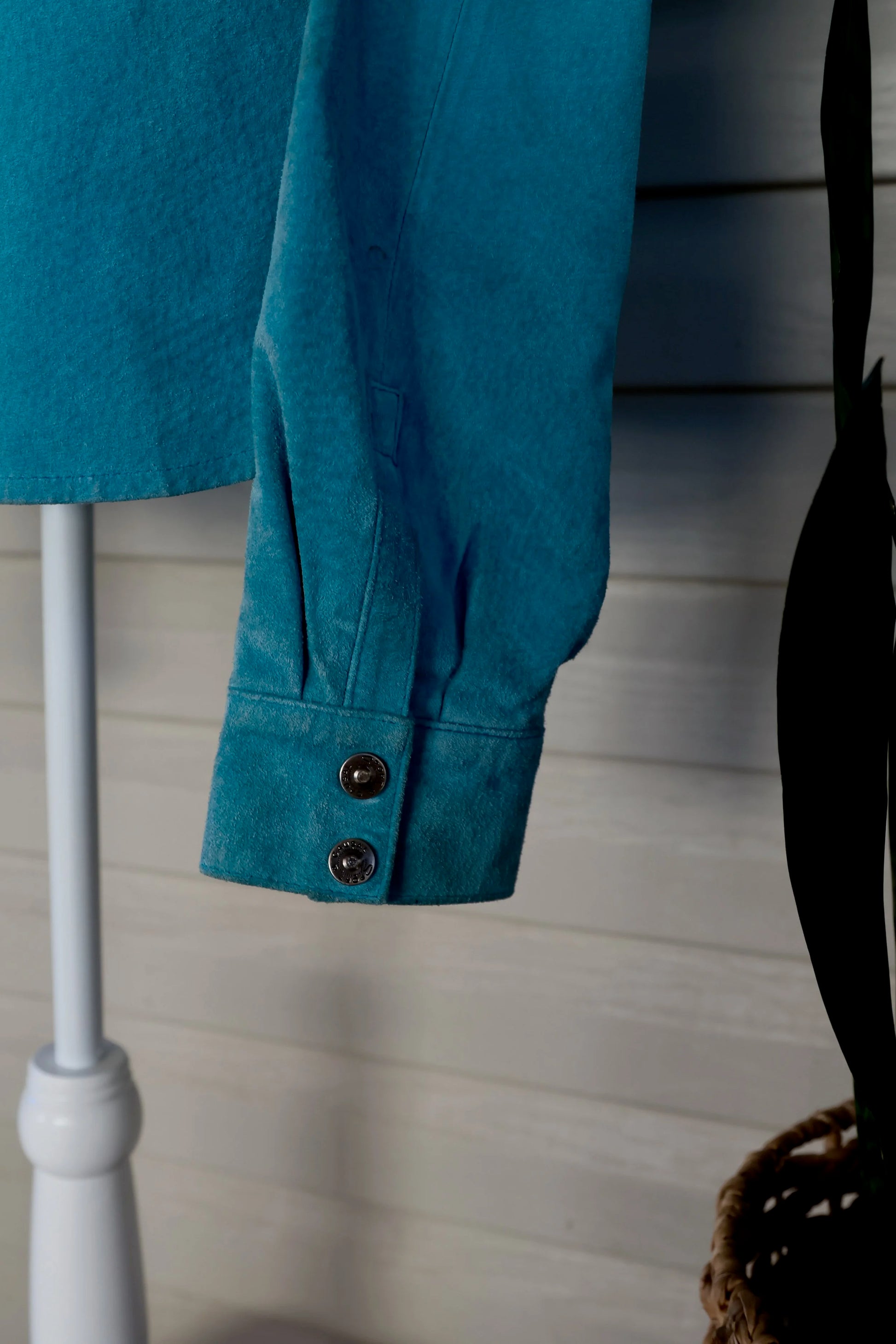 Montana Co. genuine leather shirt features a rich teal color, silver snap buttons, studded yoke detailing, and a soft polyester lining for comfort. It’s the perfect blend of rodeo-ready style and vintage cowgirl charm. Wear it open as a jacket, layered over knits, or as a statement top with denim. A standout piece for anyone who loves bold western style. Western yoke with stud detailing on front + back