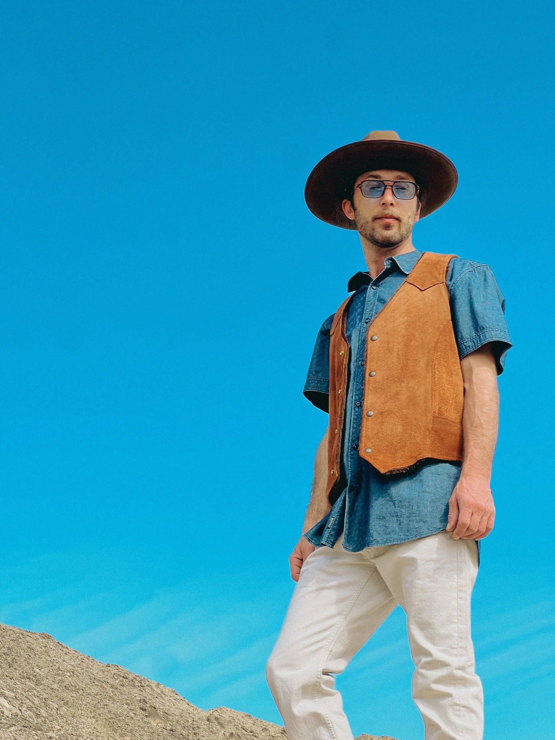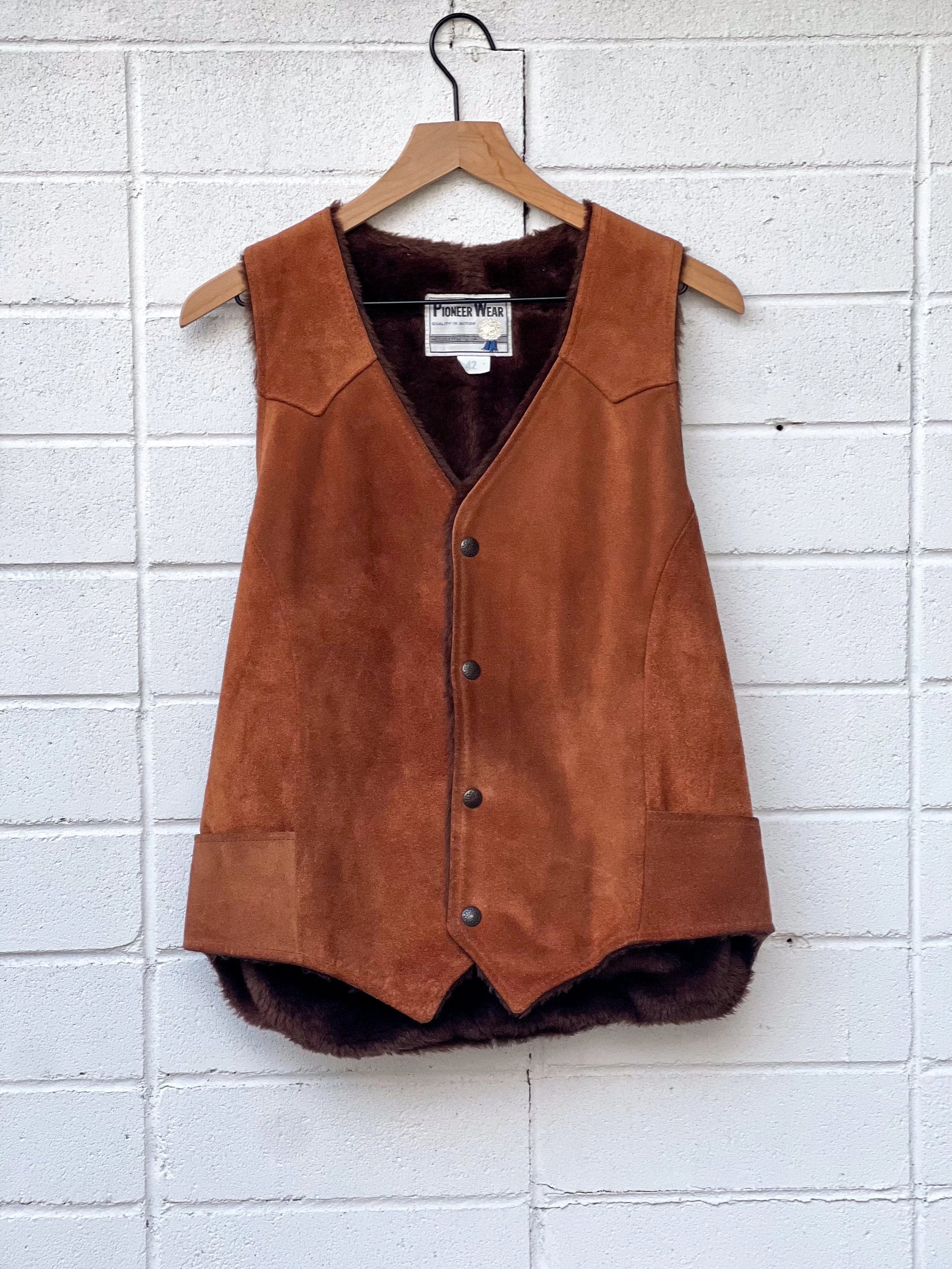 This vintage Pioneer Wear leather vest is a rugged classic, perfect for channeling timeless western style. Made from genuine leather and fully lined, it features a structured fit, front button closures, and that authentic American frontier look the brand is known for. A staple for collectors, ranchwear enthusiasts, or anyone who appreciates vintage cowboy aesthetics. Layer it over denim, flannel, or a crisp button-down for a complete western fit.