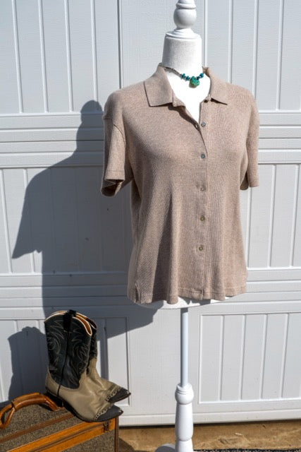 Vintage Talbots beige knit polo crafted from 100% cotton with soft texture and timeless fit.