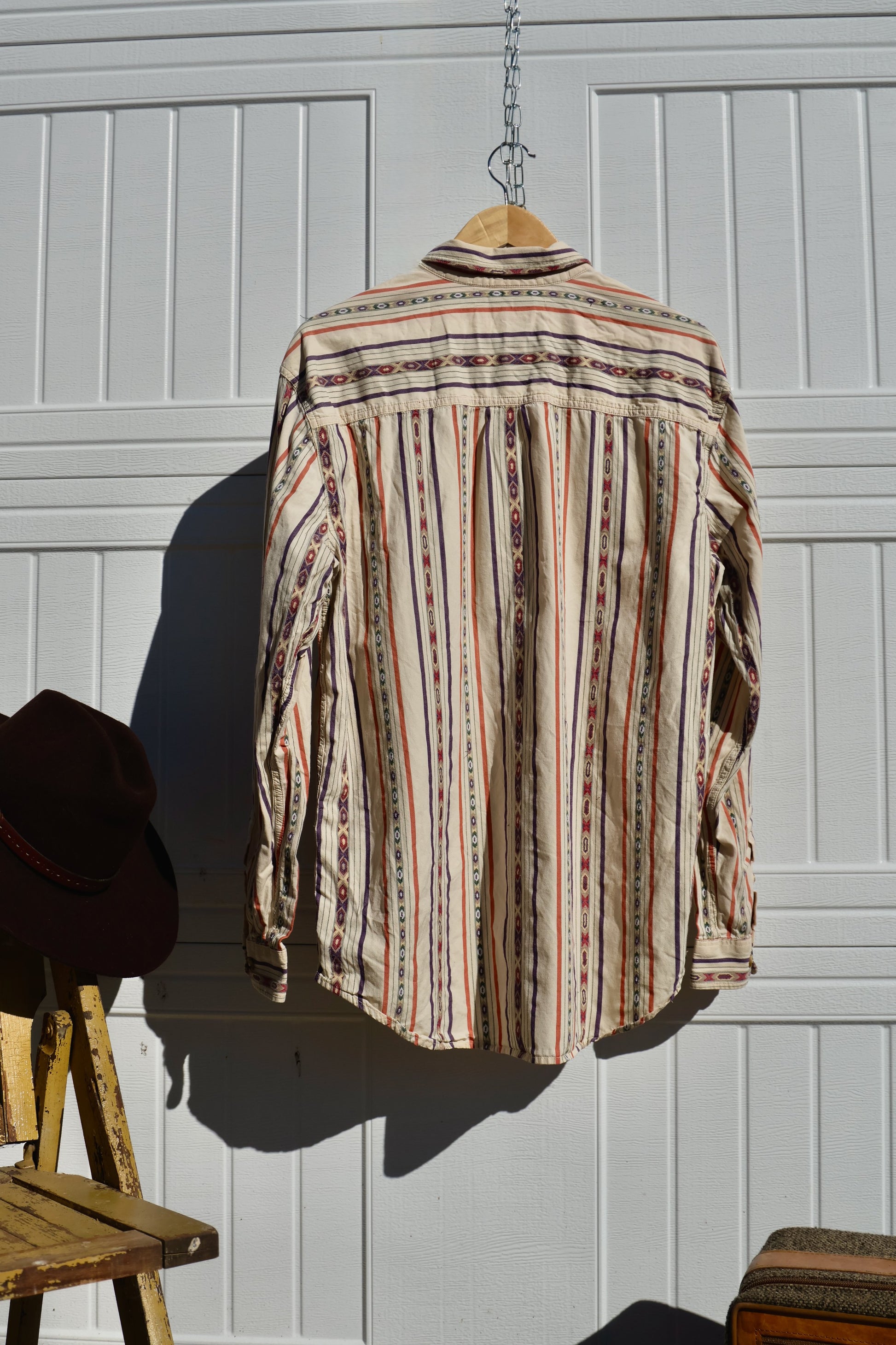 Vintage The Territory Ahead men’s long sleeve button-down shirt in soft white cotton with a subtle Southwestern-inspired print. Known for their rugged yet refined adventure style, this piece blends comfort and artistry — perfect for mountain-town living or casual Western wear.Size: Large