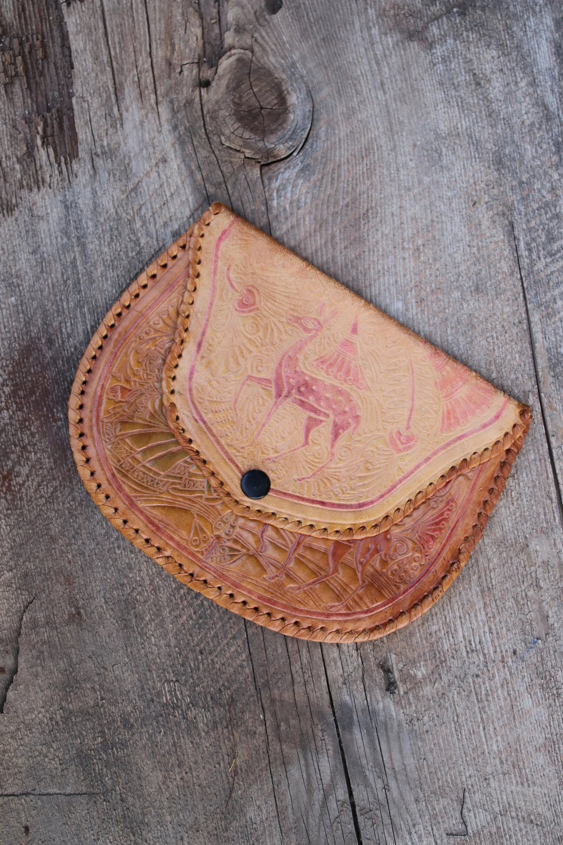 One-of-a-kind tooled leather coin purse featuring an intricate embossed wildlife scene with a fawn motif. Hand-stitched edges and natural patina make it truly special.
