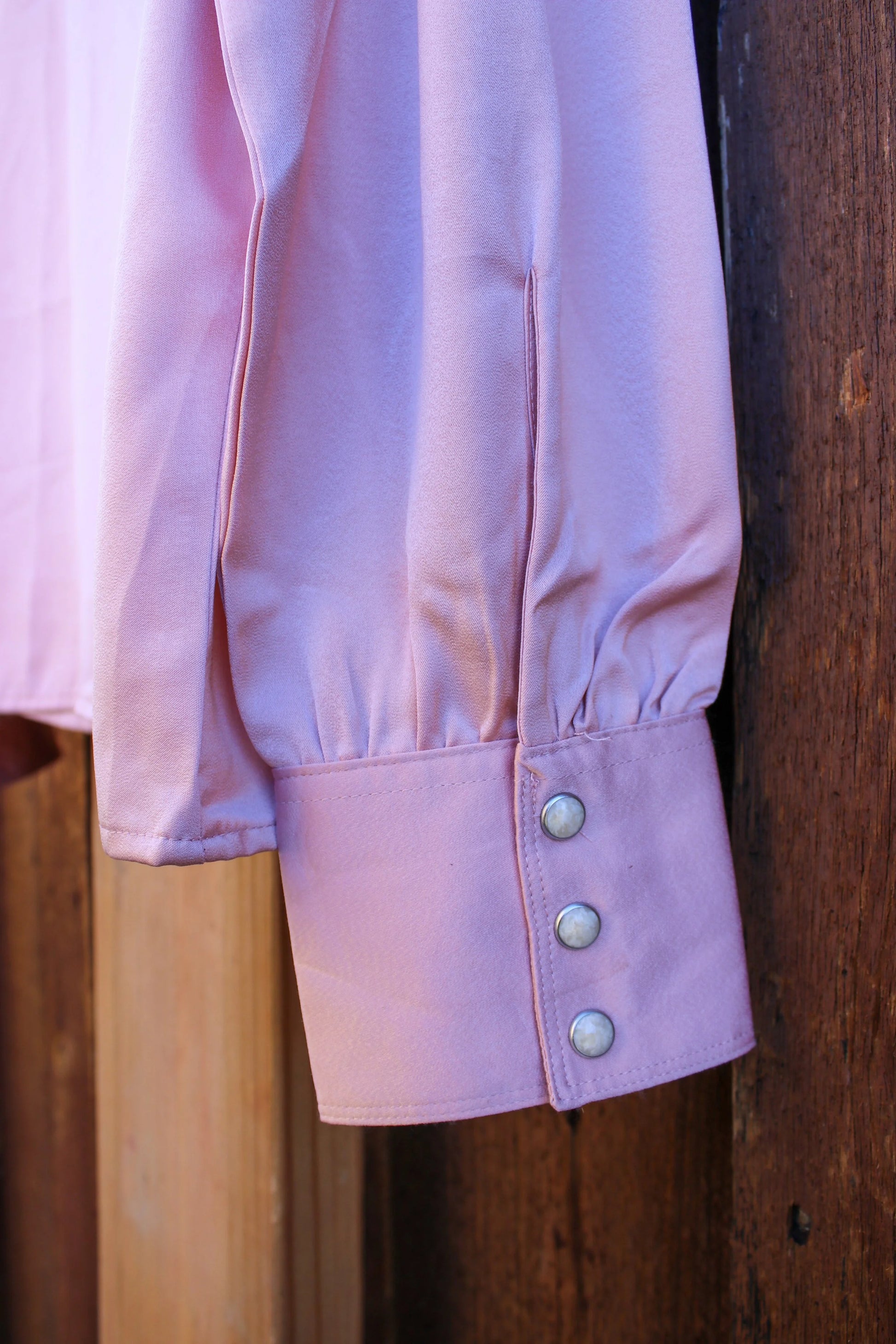 Wrangler Retro women’s light pink silky pearl snap button-down, a soft and modern twist on a Western classic. Lightweight and versatile for layering or standalone wear.